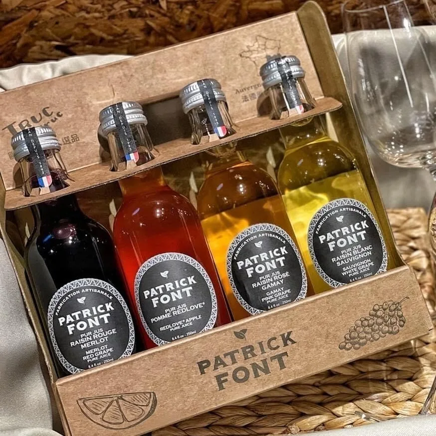 圖克圖克的 Patrick Font 精品果汁四入提盒,以「單一材質、環保油墨、無膠組合」為核心設計理念,完美展現法式簡約與永續精神,符合企業ESG目標。🌿