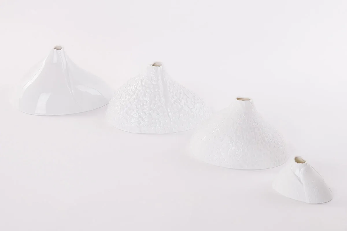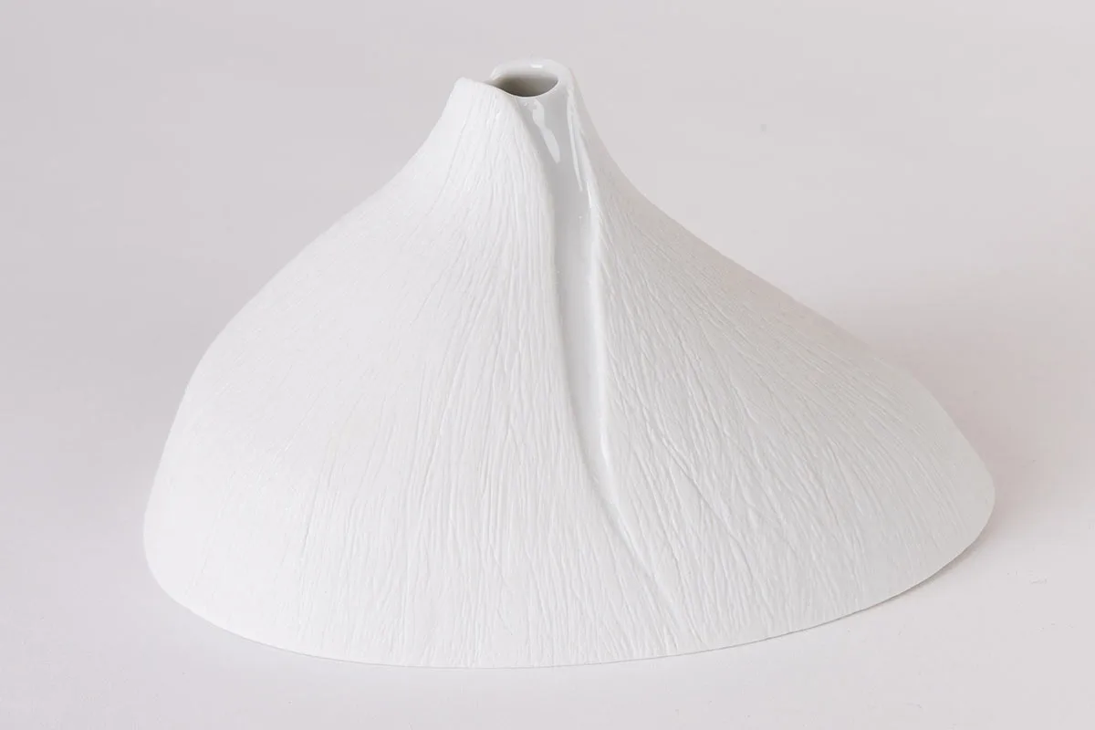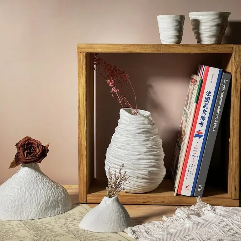 球莖植物包裹的蓬勃生命力,讓他們設計出彷彿隆起山丘的單花花瓶;銀杏葉和栗子芽的結構,則層疊出葉片紋理的高花瓶。進入白蔓瓷藝的世界,像是走進一座純白的秘密森林,彷彿可以聽見清澈潺流、聞見花香。